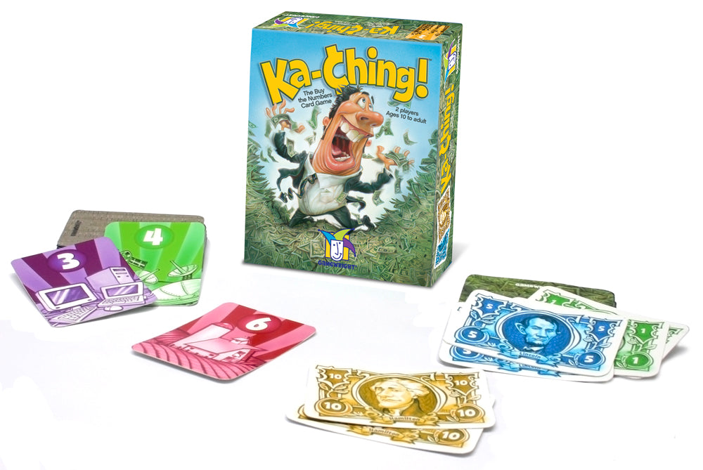 Ka-ching! ranks in our book as one of the best two-player card games we have ever seen. Ka-ching! is super easy to learn, plays quickly and yet offers endless opportunities for strategic challenge. It's also the first card game from Gamewright that emphasizes multiplication as a skill. There are many subtle strategies that you will learn as you play, but here's a quick hint: try to force your opponent into buying a card in order to uncover one that you need.