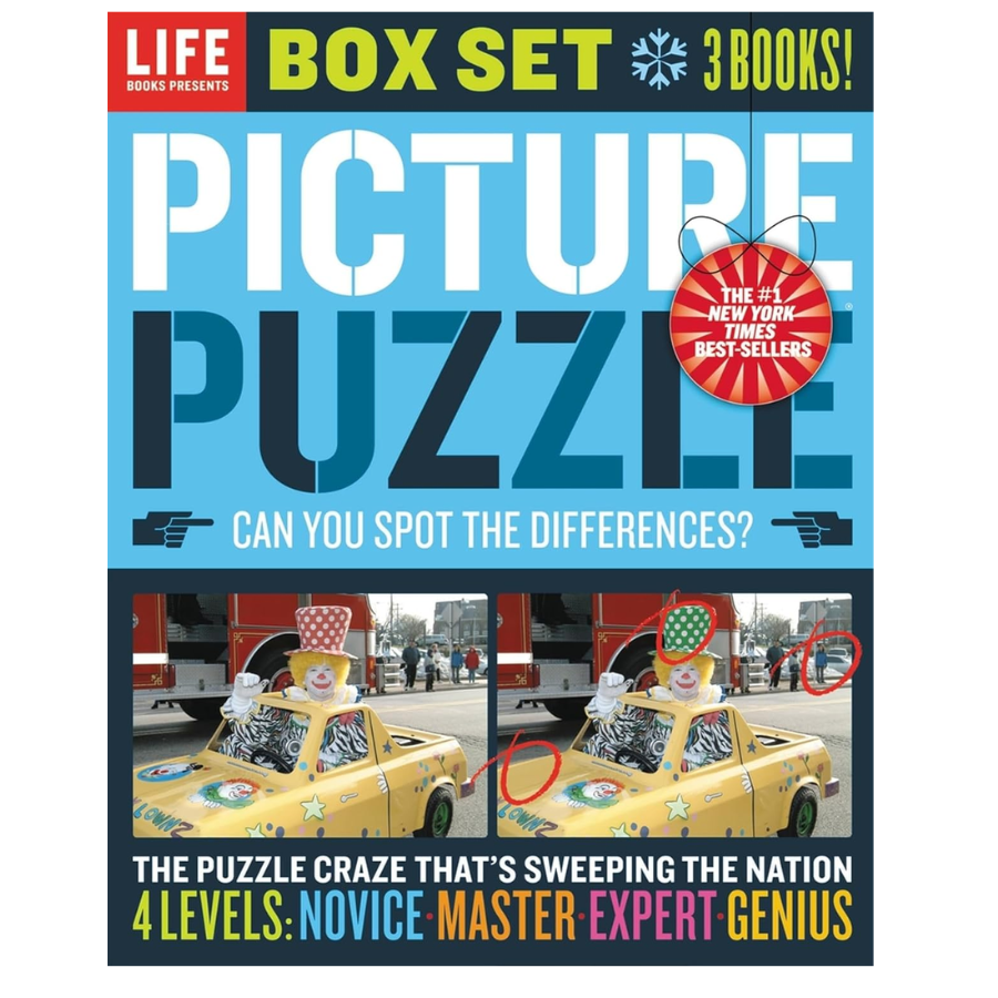The Puzzle Craze That's Sweeping the Nation! The most popular feature in Life magazine every week, perhaps the most popular weekly page in any American publication, is the Picture Puzzle. This game has become a must-have activity in a great majority of the 13 million households Life reaches every Friday. Hundreds of Life's readers have demanded "We want a Picture Puzzle book!" And here, in a special 3-book boxed set, that demand is met. There are variations on themes and variations on the game itself, as scores of color and vintage black-and-white photographs, many from the famous Time-Life Picture Archives, are twisted, doctored, and otherwise toyed with, all in the name of fun and entertainment. For the first time, the Picture Puzzle is offered in four different degrees of difficulty (Novice, Master, Expert, Genius). From the first issue of the new Life magazine, Picture Puzzle has been a hit, and the same will be true of Life's Picture Puzzle Gift Set from the moment the first copy hits the shelf.