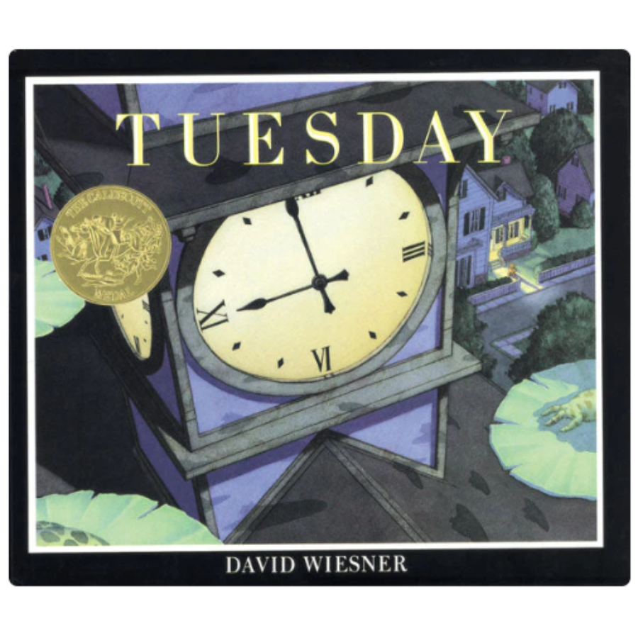 "A surreal, almost wordless picture book shows the mysterious levitation of lily pads and frogs from a pond one Tuesday at dusk. The frogs soar around town until they fall to the ground at sunrise. Large, detailed watercolors use dramatic points of view and lighting effects and often show a humorous range of expressions. There is a forecast of further surprises to come on following Tuesdays." - Horn Book